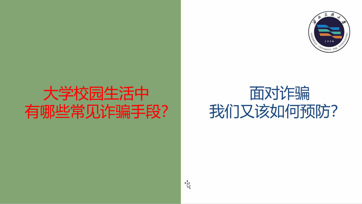 班會主要包括兩個內(nèi)容:一、大學(xué)生活中常見的詐騙手段;二、面對詐騙我們該怎么預(yù)防。
