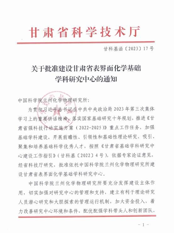 發布時間:2023-03-29 瀏覽次數:[]近日,甘肅省科技廳下發了《關于批準建設甘肅省表界面化學基礎學科研究中心的通知》,依托中國科學院蘭州化學物理研究所,由蘭州大學、西北民族大學、西北師范大學共同參與建設的甘肅省表界面化學基礎學科研究中心獲批立項建設。