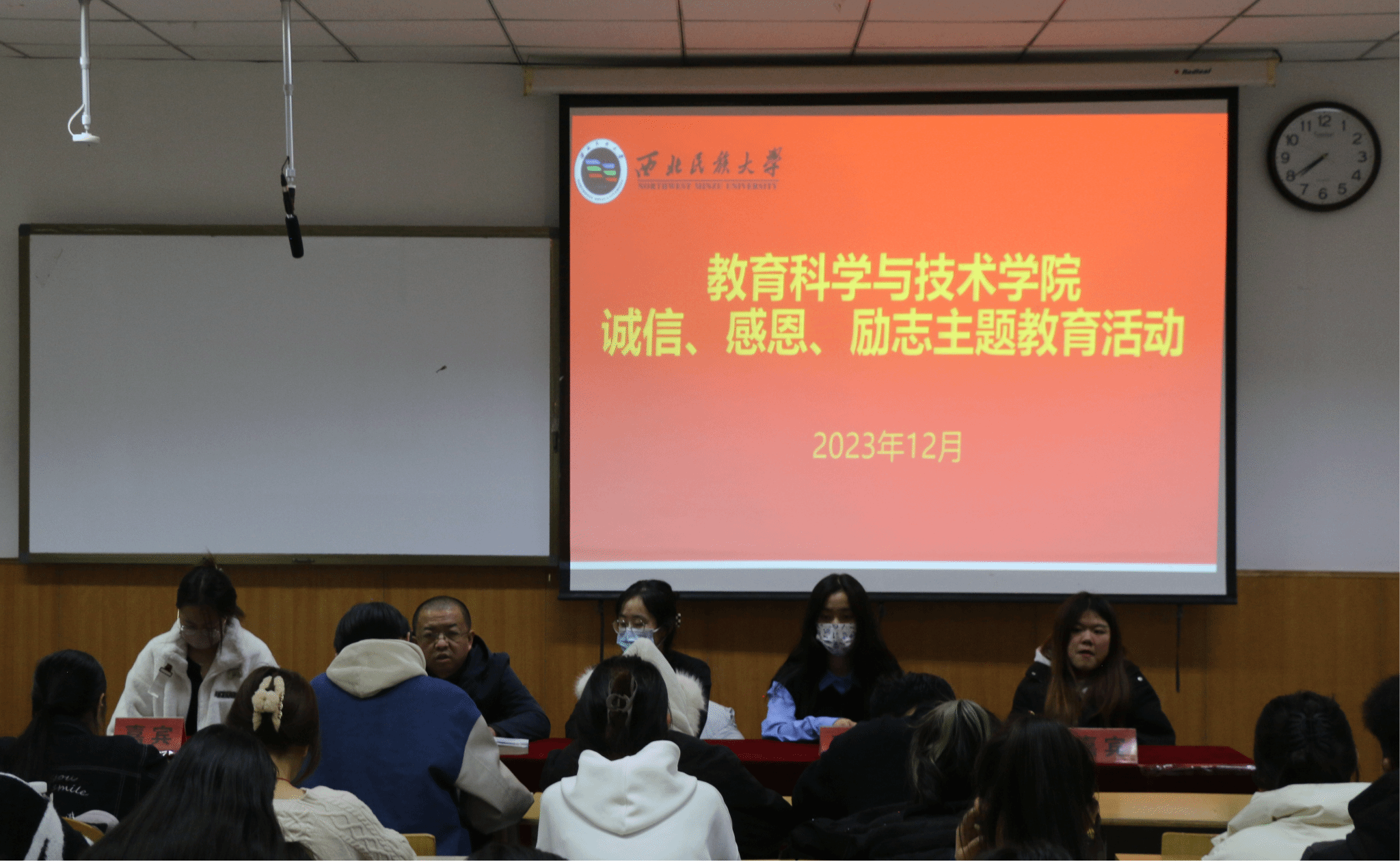 2023年12月5日,教育科學與技術學院在格物2號樓組織舉辦“誠信·勵志·感恩”主題教育活動。學院組織員王偉清、政治輔導員高潔及部分參加勤工助學和獲得國家助學金的學生代表參加。
