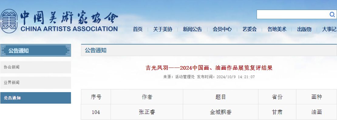 此次展覽由中國美術家協(xié)會主辦,中國文聯(lián)美術藝術中心承辦,組委會共收到來自全國9625件作品,投稿數(shù)量打破了中國美術家協(xié)會歷次國展的收稿紀錄。初評出入圍復評作品483件,最終評選出入選作品241件,其中油畫110件,中國畫131件。學院2023級專業(yè)碩士研究生張正睿作品《金城飄香》成功入選本次展覽。