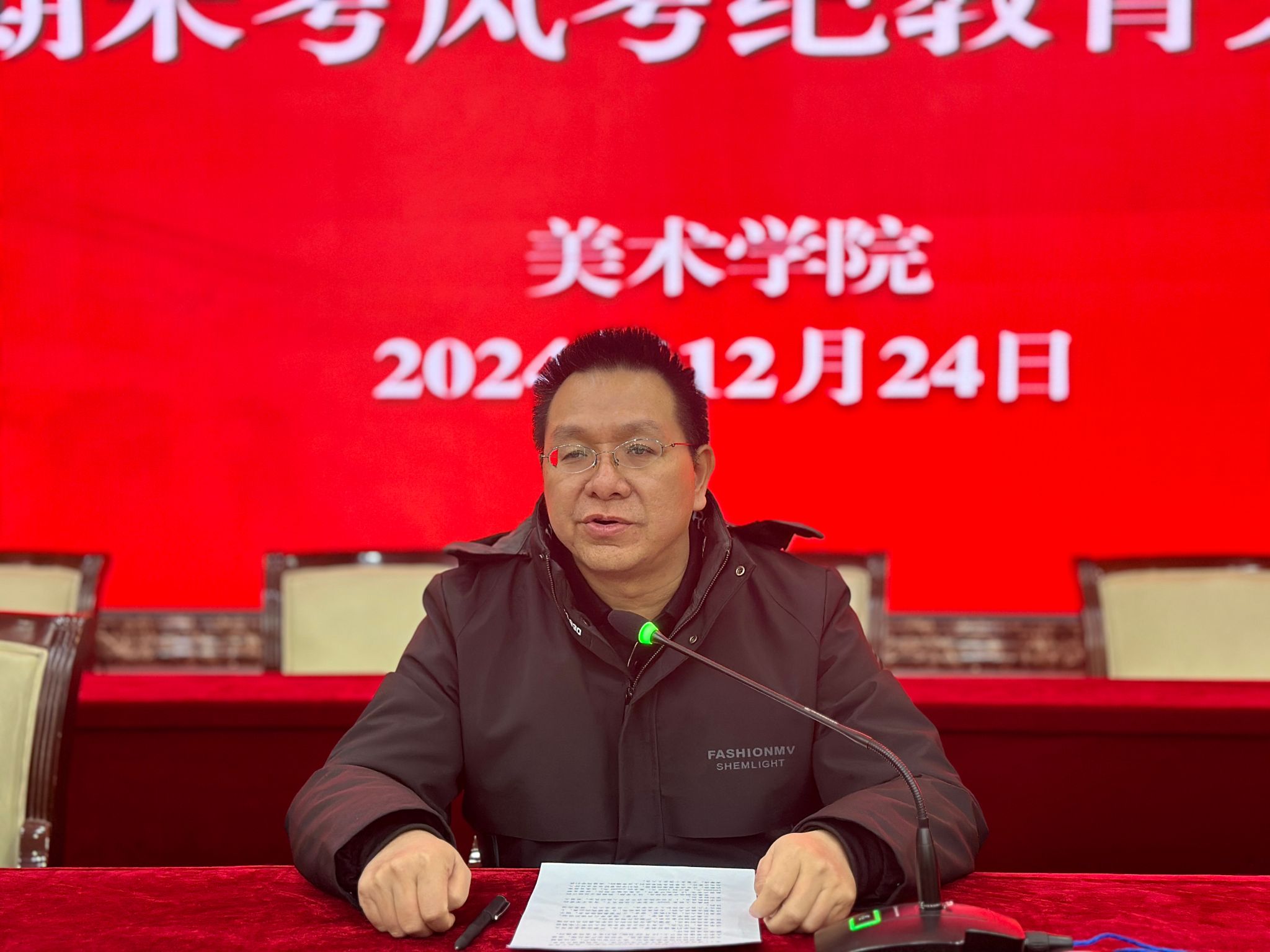 為嚴肅考風考紀、培育優良學風,美術學院于 2024 年 12 月 24 日在西北新村校區文津樓學術報告廳召開期末考試考風考紀教育大會。學院黨委書記蘇知洋、副院長馮炳超、王茜及全體學生參加,會議由團委書記王媛媛主持。