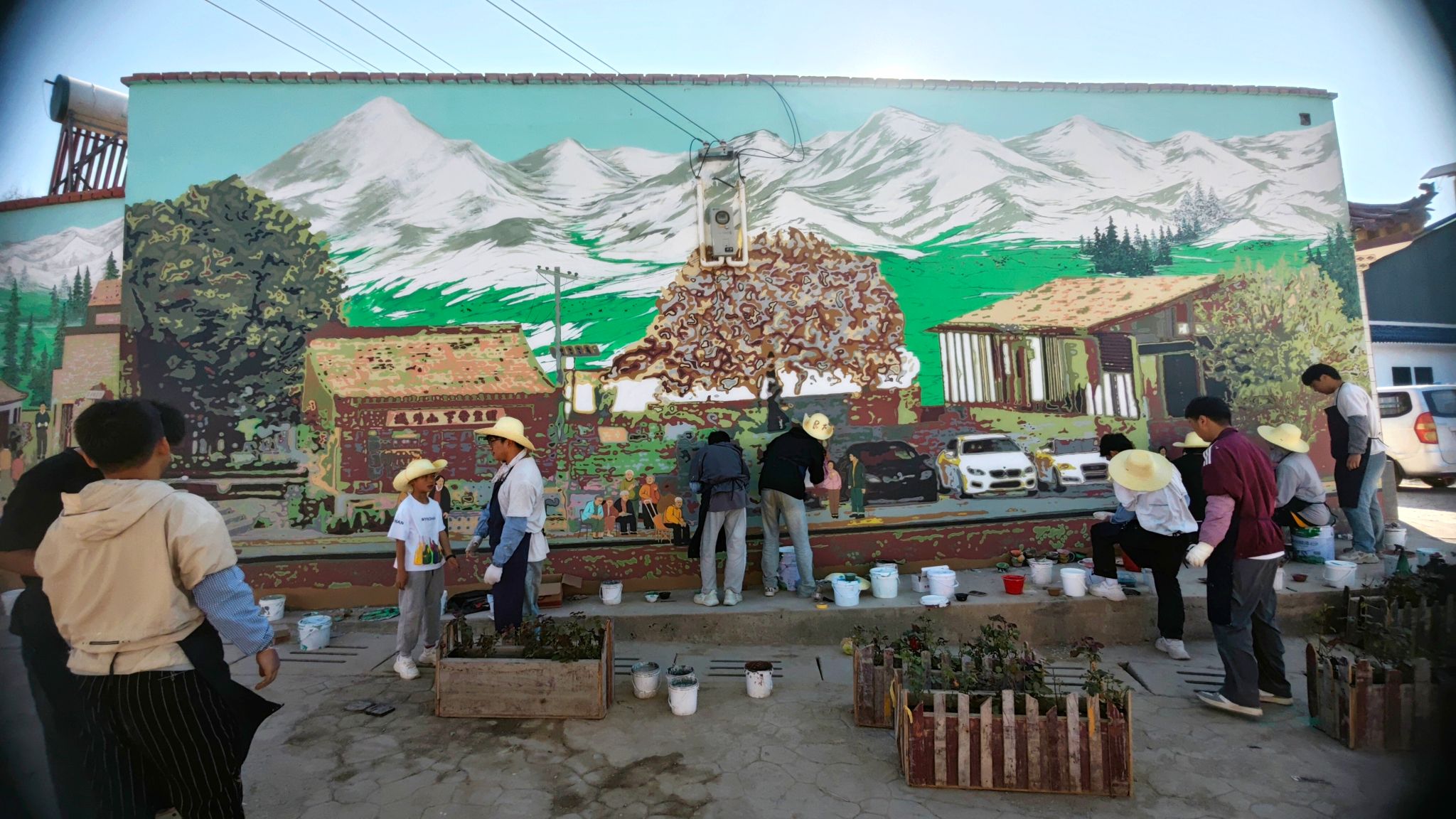 6月初,施工全面鋪開。師生們頂著烈日、踏著晨露,以丙烯為墨、以墻面為紙,將灰白的鄉村墻壁轉化為流淌的藝術長廊:《屋頂交響》——層疊單坡屋頂躍然墻面,再現農耕文明智慧;《守望》——鄰里互助、孝老愛親場景,彰顯淳樸鄉風;《麥浪山花》——本土生態意象鋪陳宜居詩畫。墻繪甫一亮相,即吸引村民駐足欣賞、拍照留念,被譽為“家門口的露天美術館”。