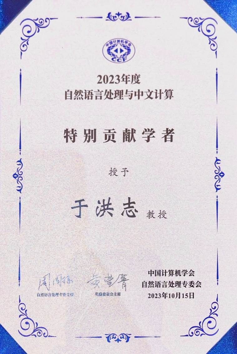 10月15日,在自然語言處理與中文計算NLPCC 2023年度會議上,中國計算機學會自然語言處理專委會授予我校于洪志教授2023年度自然語言處理與中文計算“特別貢獻學者”稱號,以表彰于洪志教授在自然語言處理領域所做出的特別貢獻。