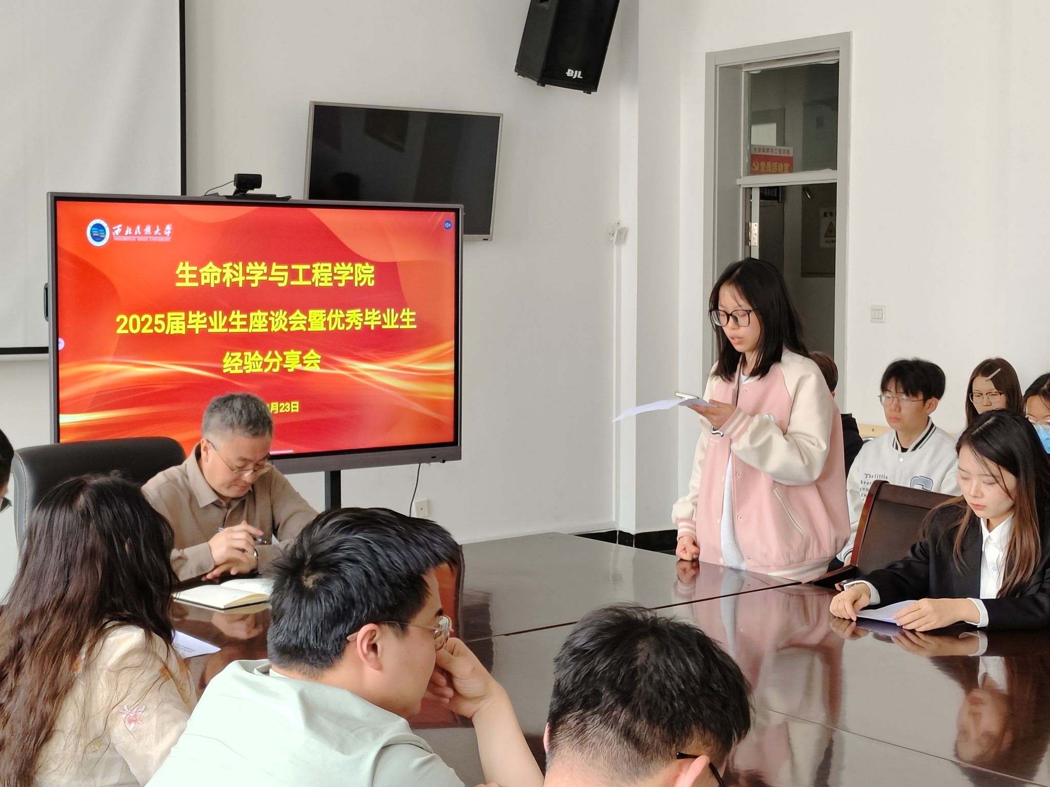 為加強學院與畢業生之間溝通交流,充分發揮優秀畢業生的榜樣引領作用,4月23日,生命科學與工程學院舉辦 2025 屆畢業生代表座談會暨優秀畢業生經驗分享會。會議由輔導員孫烈舉主持,學院黨委書記趙仁杰、輔導員沙拉買提和2025屆畢業生代表、各年級學生代表參會。