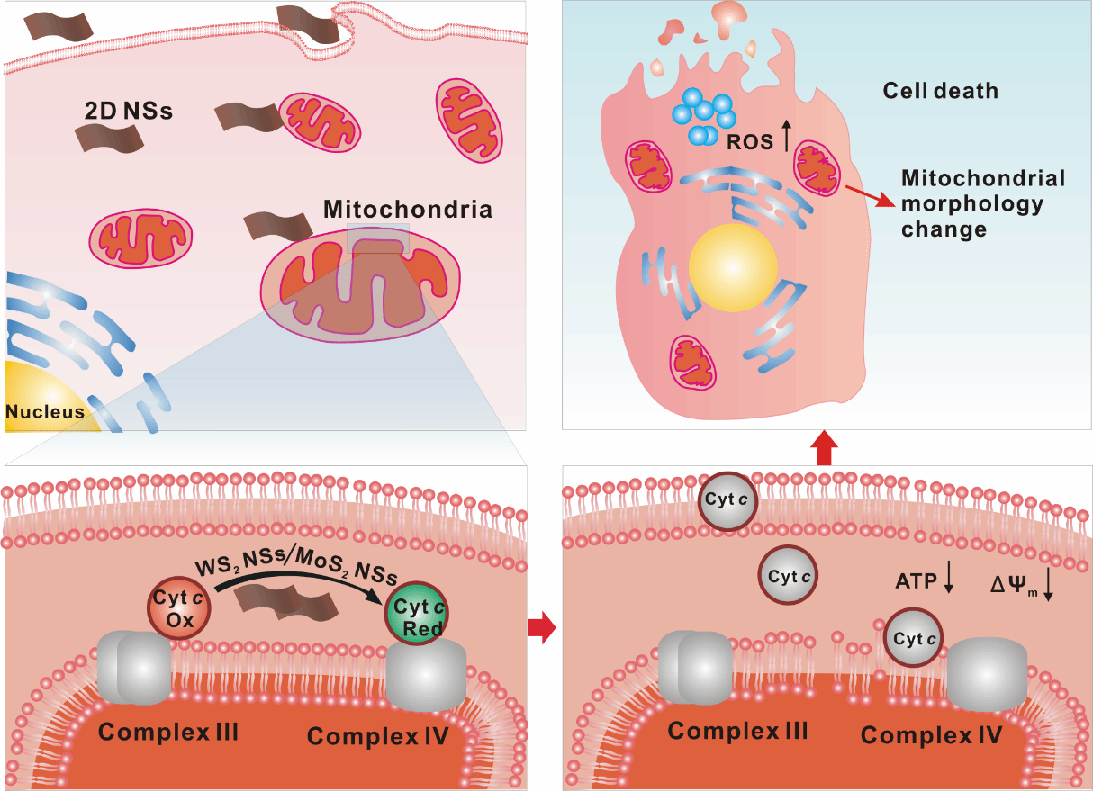 團隊以細胞色素c(Cyt c)為模型生物分子,基于2D NSs的氧化還原性質,利用微流控相關技術(脈沖流動電勢法和毛細管電泳發)系統評價了2D NSs的細胞毒性。課題組通過脈沖流動電勢法(SP)和毛細管電泳法(CE)定量表征了2D NSs與Cyt c的界面相互作用、氧化還原作用和生物溶解作用。隨后,在體外用Hela細胞研究了2D NSs的氧化還原活性與Cyt c相關生物功能之間的關系。結果表明,在弱界面相互作用和低樣品體積下,WS2 NSs和MoS2 NSs都可以在沒有顯著生物溶解的情況下還原Cyt c。同時,細胞水平相關實驗表明,2D NSs的還原性質和Cyt c功能障礙相關參數的改變成正相關,包括ATP合成降低、線粒體膜電位的改變降低和ROS含量的增加。