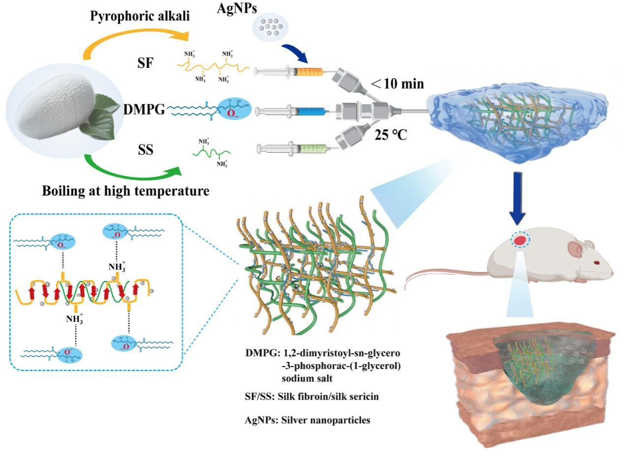 蠶繭中絲素蛋白具有優異生物相容性、機械性能和生物活性,其在藥物傳遞、皮膚傷口愈合等領域顯示出極大的潛力。本研究借鑒了自然蠶繭的形成過程,通過引入1,2-二肉豆蔻酰-sn-甘油-3-磷酸-(1-甘油) 鈉鹽(DMPG)來構建水凝膠,并對水凝膠的形態學、機械強度、抗菌效果、細胞毒性以及傷口愈合特性進行了全面表征。結果表明,該水凝膠不僅具有出色的親水性、更強的機械性能,還展現出優異的抗菌效果。此外,這種水凝膠細胞毒性低,在減少炎癥細胞因子產生、加速傷口愈合和提供保護方面展現出巨大潛力。研究不僅提出了基于絲素蛋白水凝膠促進傷口愈合的新方法,同時為醫療領域帶來了一種新的治療選擇。