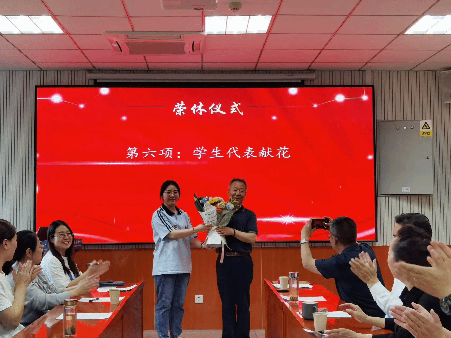 榮休儀式上,黨委教師工作部、人事處領導宣讀退休文件,學校離退休工作處安永國書記、中心直屬黨支部哈玉梅書記為令世鑫老師頒發紀念章、榮譽證書,學生代表獻上鮮花。