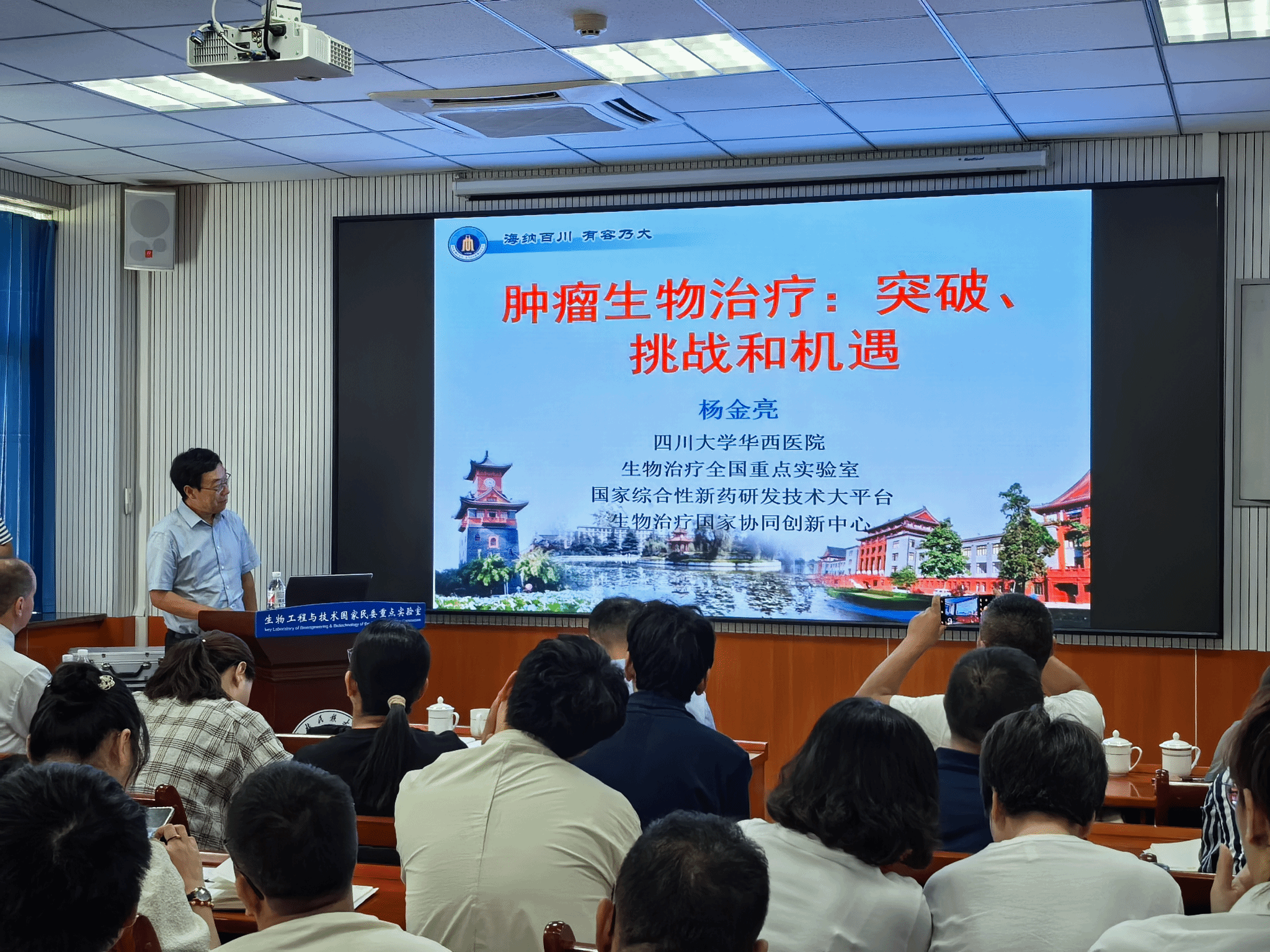 應學校邀請,四川大學教授楊金亮于2024年7月19日來校開展學術交流,并在西北新村校區生物工程樓二樓會議室作了題為“腫瘤生物治療:突破、挑戰和機遇”的學術報告。生物醫學研究中心、生命科學與工程學院師生80余人參加了報告會。