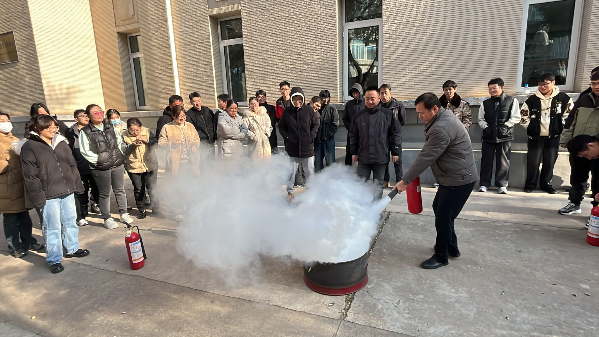 期間還開展了火災(zāi)應(yīng)急處置及逃生演練,演練模擬火災(zāi)場景釋放煙霧引發(fā)警報,師生們用衣物、毛巾等捂住口鼻,在技術(shù)人員指導(dǎo)下有序疏散,撤離至安全區(qū)域。疏散演練后進(jìn)行滅火器規(guī)范使用講解及滅火演練,還針對危險化學(xué)品泄露等情況,進(jìn)行了應(yīng)急處置知識學(xué)習(xí)和現(xiàn)場演練。
