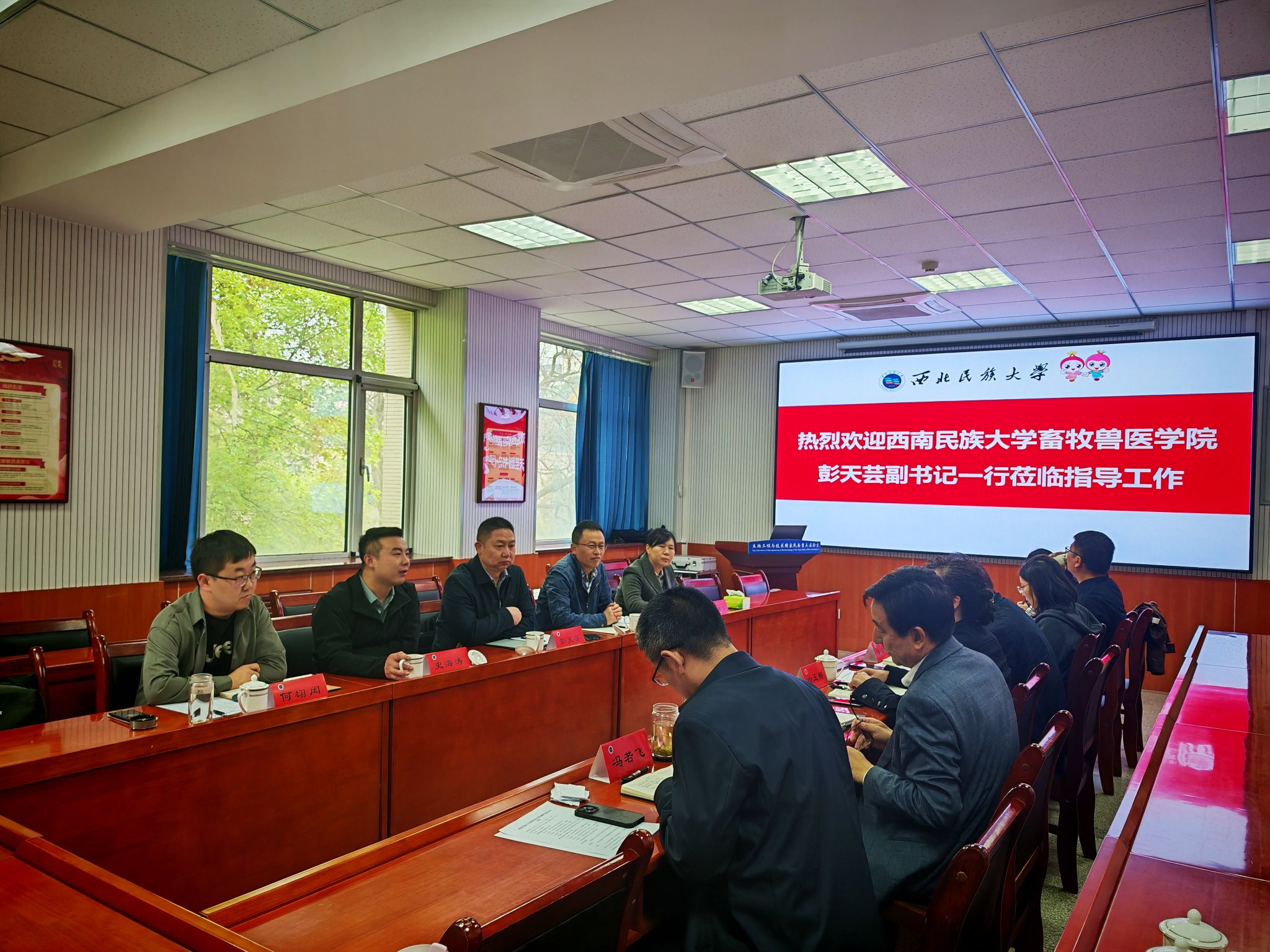 座談會上,柏家林主任介紹了中心基本情況,賀慶華、史海濤兩位副院長介紹了西南民族大學畜牧獸醫學院基本情況,雙方圍繞學科建設、實驗室建設、人才培養、科學研究和社會服務等開展座談交流。柏家林主任表示,雙方同為兄弟院校,希望聚焦共性需求,進一步加強合作交流,為服務西部民族地區高質量發展貢獻力量。