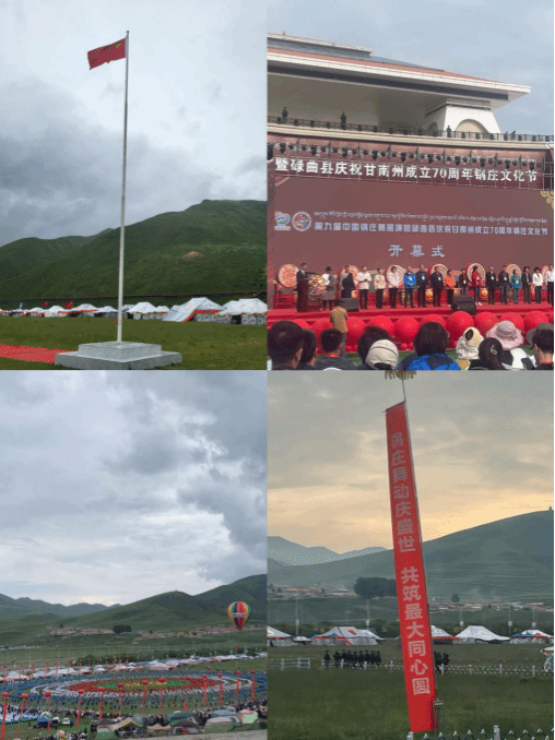 7月26日,第九屆中國鍋莊舞展演暨碌曲縣慶祝甘南藏族自治州成立70周年鍋莊文化節(jié)在夏澤灘草原開幕。實(shí)踐團(tuán)成員在老師的帶領(lǐng)下參加活動(dòng)開幕儀式。在盛會(huì)現(xiàn)場,鼓樂齊鳴、彩旗飄揚(yáng)、人群熙攘,各族群眾和州內(nèi)外游客相聚一堂,感受著盛會(huì)帶來的喜慶祥和氣氛,演出在舞蹈《盛世鼓舞》中拉開帷幕,五彩繽紛的節(jié)目寄托著他們對家鄉(xiāng)和祖國的熱愛、祝福。