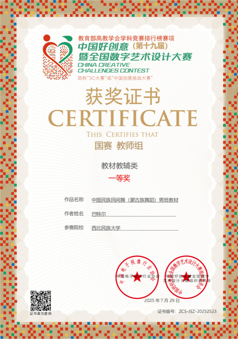 中國好創(chuàng)意暨全國數(shù)字藝術(shù)設(shè)計大賽是教育部高等教育學會學科競賽排行榜內(nèi)重點賽項,賽事覆蓋全國高校師生,以專業(yè)性、權(quán)威性和創(chuàng)新性著稱,是檢驗高校教學成果與教師科研能力的重要平臺。巴特爾編寫的《中國民族民間舞(蒙古族舞蹈)男班教材》,立足民族舞蹈的文化根源與藝術(shù)特質(zhì),打破傳統(tǒng)教材的單一性,通過數(shù)字化教學資源拓展了教學場景,為民族舞蹈人才培養(yǎng)提供了全新的教學范式。
