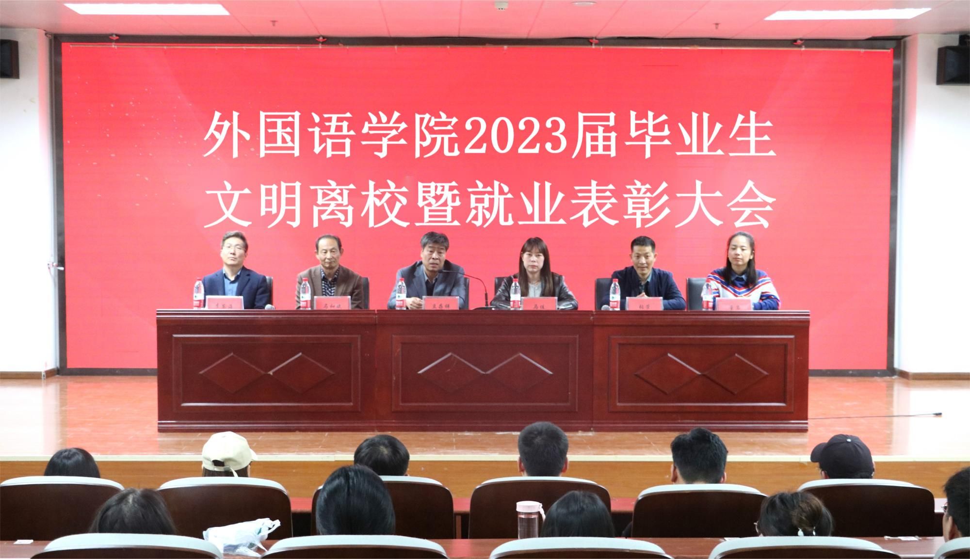 2023年5月9日晚,外國語學院2023屆畢業生文明離校暨就業表彰大會在榆中校區就業大廳隆重舉行。外國語學院黨委書記豆存祥、黨委副書記馬佳、副院長馬和斌、張榮,教學管理辦公室主任李東海、輔導員董巖以及外國語學院2023屆全體畢業生出席典禮。號角催征,壯歌奮楫,大家共同見證畢業生們圓滿完成學業,躊躇滿志開啟新征程。