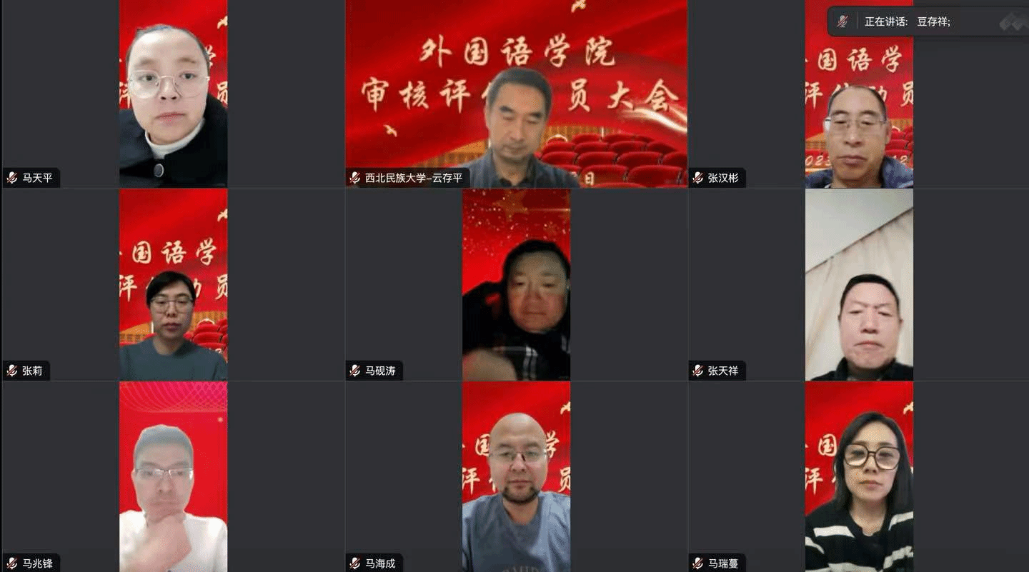 2023年11月14日,西北民族大學外國語學院在線召開本科教育教學審核評估工作動員會。會上,馬納琴院長強調,本科教育教學審核評估工作,是對外國語學院本科教學工作的檢驗,是對全院教職工的考驗和提升,全院上下要提高站位,認識評估工作的重大意義,扎實做好審核評估工作。