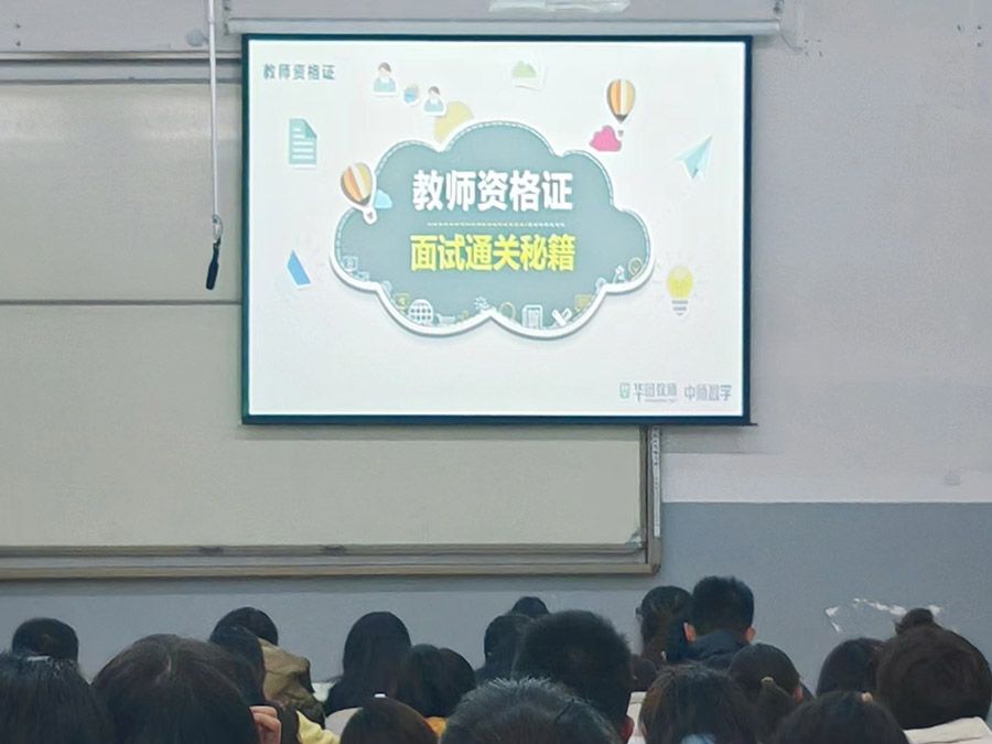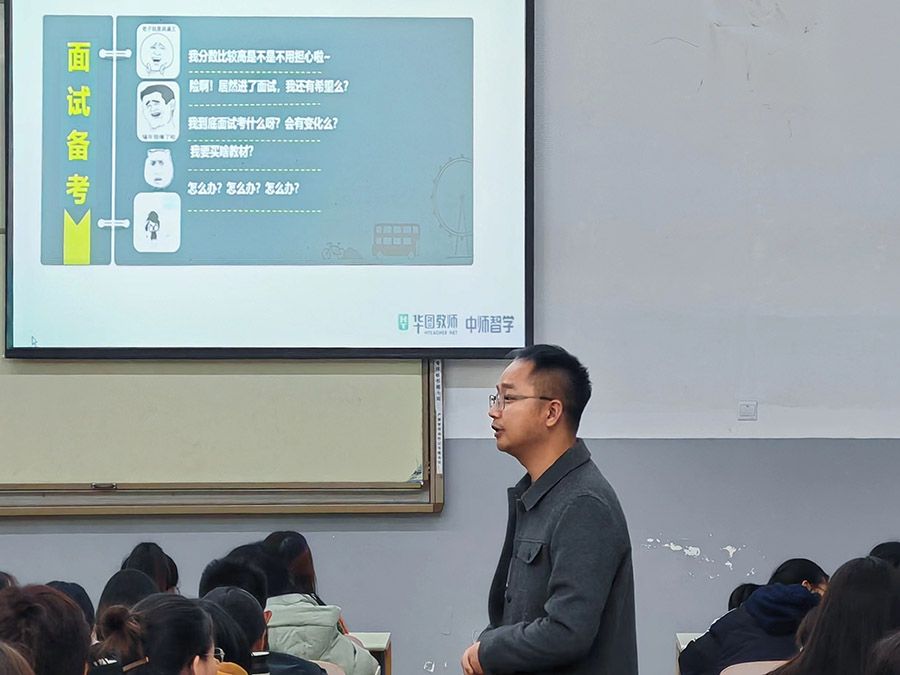 為幫助學生深入了解國家教師資格證考試相關政策,提升國家教師資格證考試應試能力,11月22日晚在致真樓107教室,我院特邀華圖教育王飛老師開展“優質就業,定格成師”教師資格證面試技能提升講座。