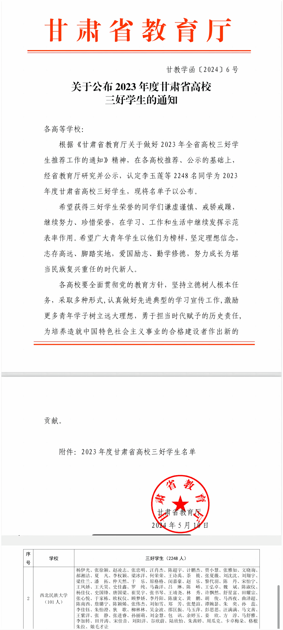 近日,甘肃省教育厅下发文件公布了2023年度甘肃省高校三好学生名单。学校共有101名学生获“2023年度甘肃省高校三好学生”荣誉称号。