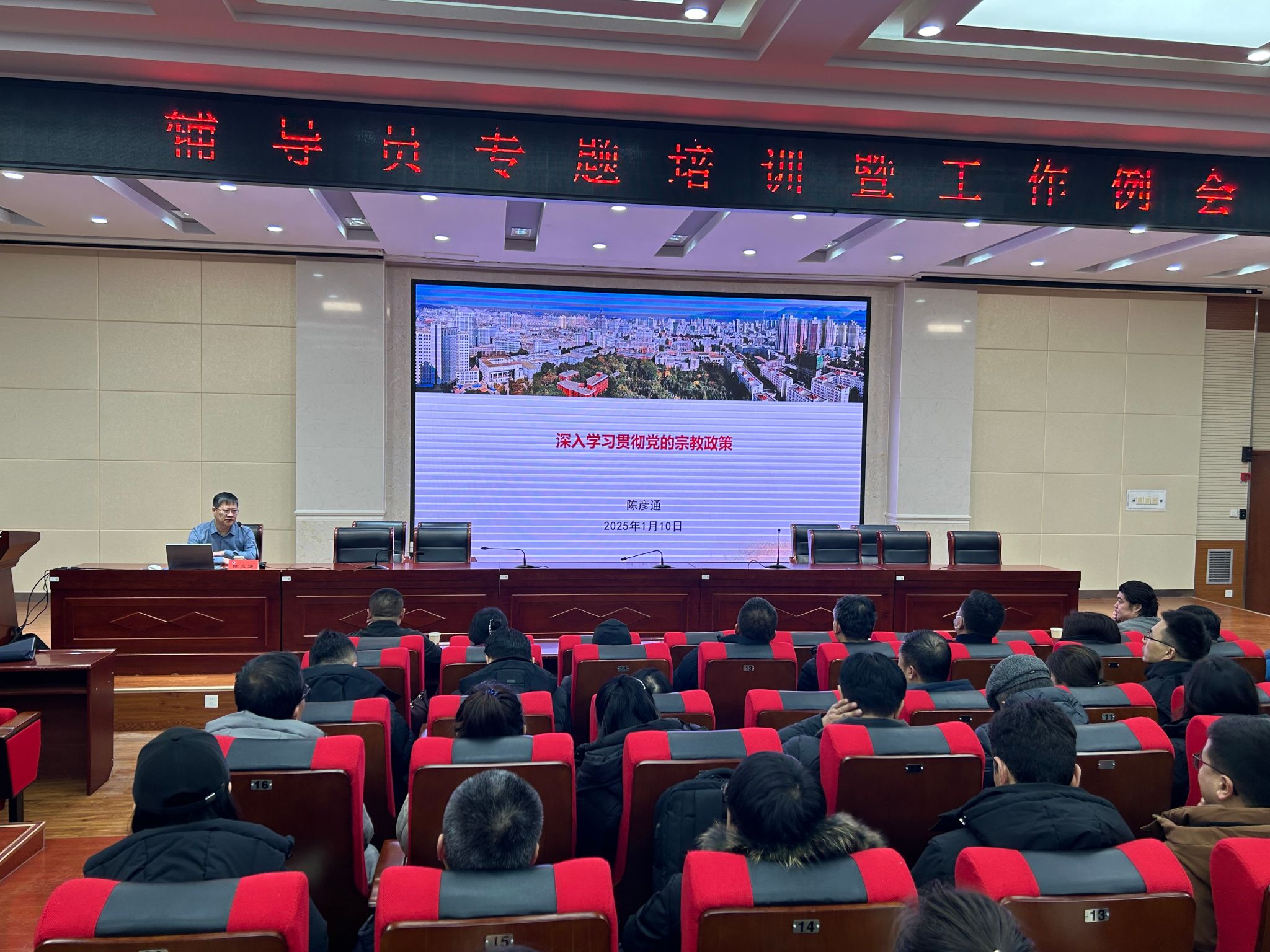 1月10日,学校在榆中校区致真楼125学术报告厅举办辅导员专题培训。学生工作部邀请兰州大学统战部常务副部长陈彦通同志作报告。全体辅导员、部分班导师、学生工作部、团委有关人员参加培训。培训结束后,全体辅导员召开2024年秋季学期第四次辅导员工作例会,党委常委、副校长徐绍文出席会议并讲话。