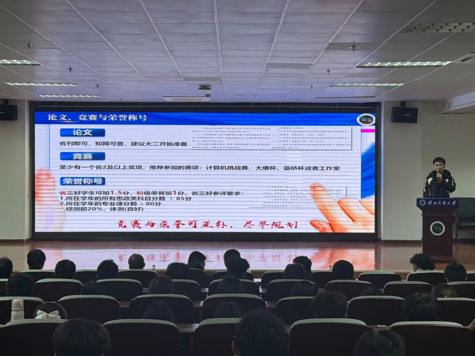 在分享环节,3位优秀学子结合自身经历,为低年级同学提供了丰富而实用的大学学习与生活指南。化工学院廖光辉同学从技能备考、科研训练切入,引导学弟学妹正确看待失败,在多元尝试中实现自我突破。电气工程学院汪肖杰同学阐述了“绩点提升、竞赛突破、团学工作”三位一体的成长策略。数学与计算机科学学院曹弦同学立足专业背景,聚焦高等数学和计算机语言主干课程学习,分享了自己在路径方法和目标达成等方面的有益经验。