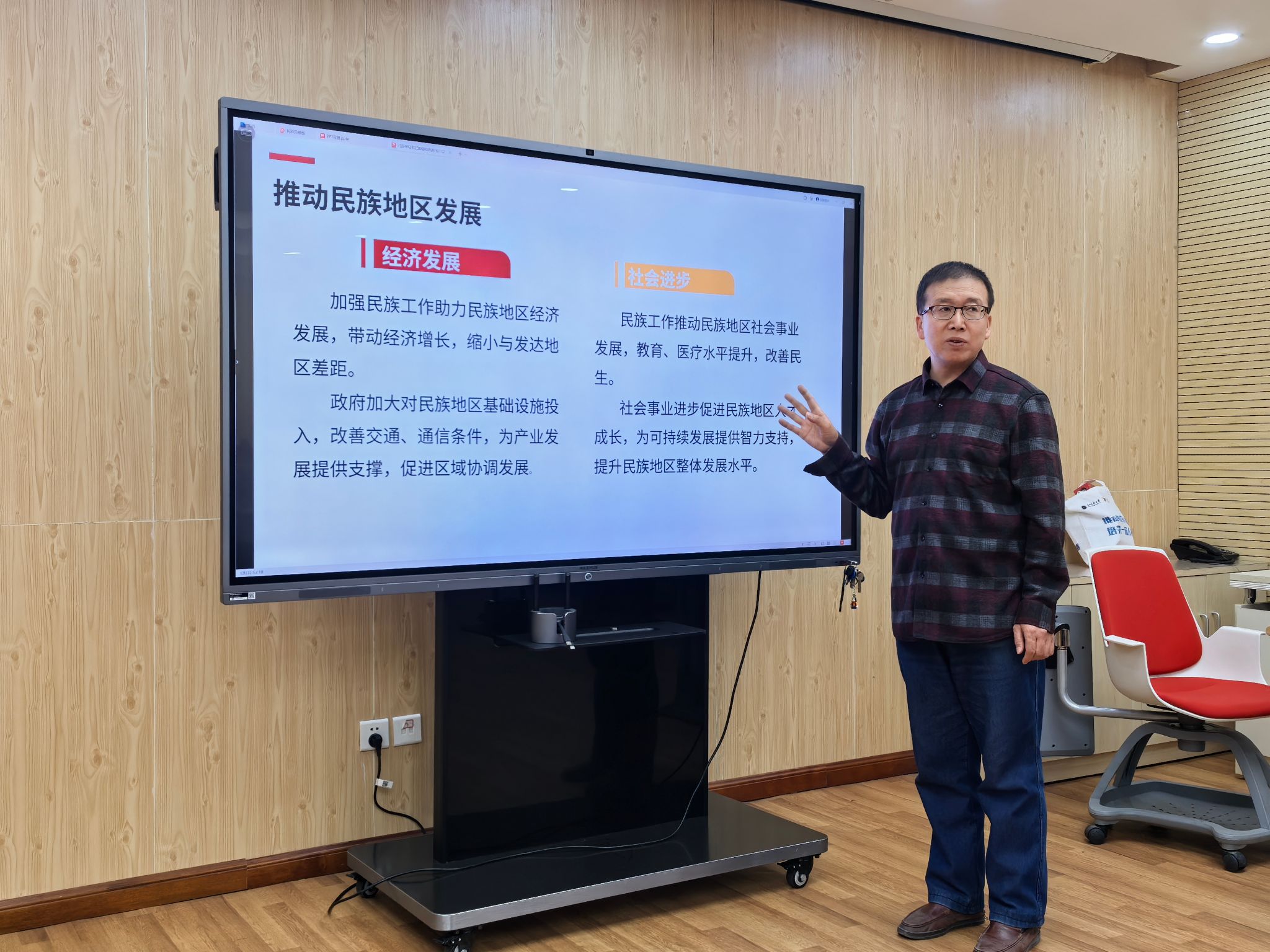 3月26日下午,預(yù)科教育學(xué)院教工黨支部書記楊文泰以“深入學(xué)習(xí)習(xí)近平總書記關(guān)于加強(qiáng)和改進(jìn)民族工作的重要思想”為題,為全體黨員講授了一場(chǎng)專題黨課。此次黨課通過(guò)系統(tǒng)闡釋與互動(dòng)交流相結(jié)合的方式,進(jìn)一步凝聚了黨員鑄牢中華民族共同體意識(shí)的思想共識(shí)。