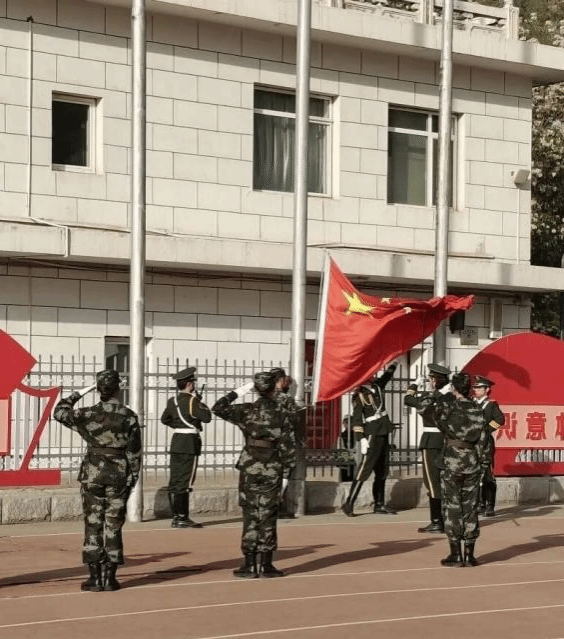 迎著初升的朝陽,英姿颯爽的國旗護衛隊隊員們邁著整齊劃一、鏗鏘有力的步伐護送鮮艷的五星紅旗進場。隨著高亢激昂的《義勇軍進行曲》的旋律響起,五星紅旗在晨光中緩緩升起,迎風飄揚,全體師生肅立、行注目禮。