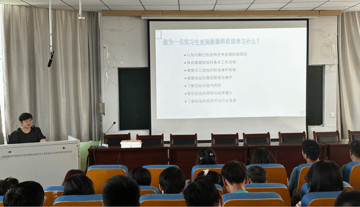 首先,郭雅瓊主任以“檢驗(yàn)實(shí)習(xí)生崗前培訓(xùn)”為題,系統(tǒng)講解了檢驗(yàn)科下設(shè)的科室,作為一名實(shí)習(xí)生來到檢驗(yàn)科應(yīng)該認(rèn)知與熟記檢驗(yàn)科各專業(yè)組檢測(cè)項(xiàng)目、熟練掌握檢驗(yàn)科基本工作流程、掌握手工檢驗(yàn)的標(biāo)準(zhǔn)操作規(guī)程、掌握檢驗(yàn)儀器的原理及操作、了解定標(biāo)與室內(nèi)質(zhì)控、熟知報(bào)告的申核與臨床意義、了解檢驗(yàn)的前技術(shù)與行業(yè)前景。隨后郭主任又根據(jù)工作中的實(shí)際案例重點(diǎn)強(qiáng)調(diào)作為醫(yī)務(wù)人員應(yīng)該注意的實(shí)驗(yàn)室生物安全及醫(yī)療廢物危害,不幸感染后的緊急措施,做好個(gè)人防護(hù)工作,內(nèi)容生動(dòng),講解細(xì)致,引來了同學(xué)們轟動(dòng)的掌聲。