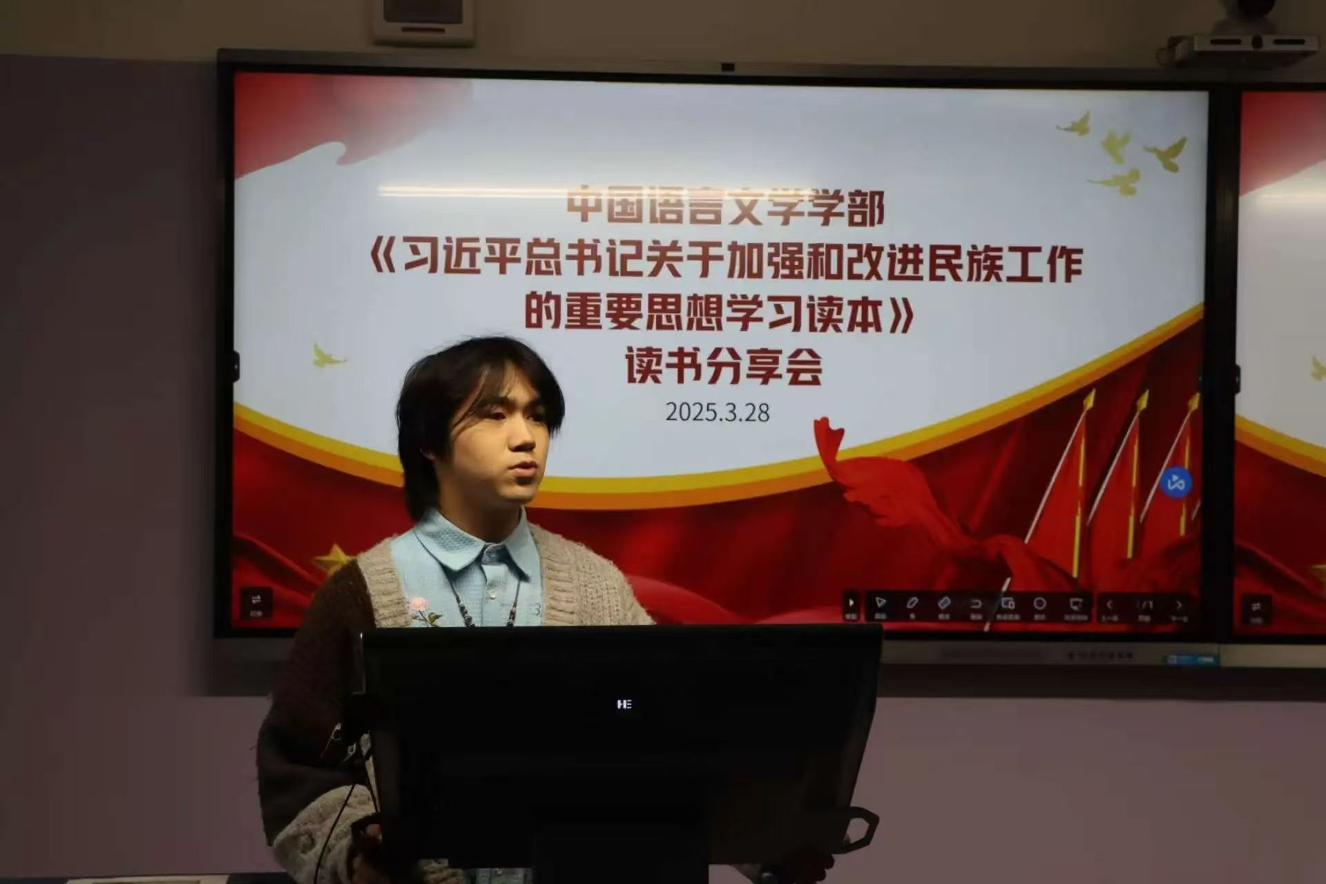 為深入貫徹習(xí)近平總書記關(guān)于加強(qiáng)和改進(jìn)民族工作的重要思想,引導(dǎo)同學(xué)們深刻領(lǐng)悟鑄牢中華民族共同體意識(shí)的豐富內(nèi)涵,3月28日,中國(guó)語言文學(xué)學(xué)部在博雅樓317教室舉辦了以學(xué)習(xí)《習(xí)近平總書記關(guān)于加強(qiáng)和改進(jìn)民族工作的重要思想學(xué)習(xí)讀本》為主題的讀書分享研討會(huì)。此次活動(dòng)由魏宇寧同學(xué)擔(dān)任主持,學(xué)部50余名學(xué)生代表參與。