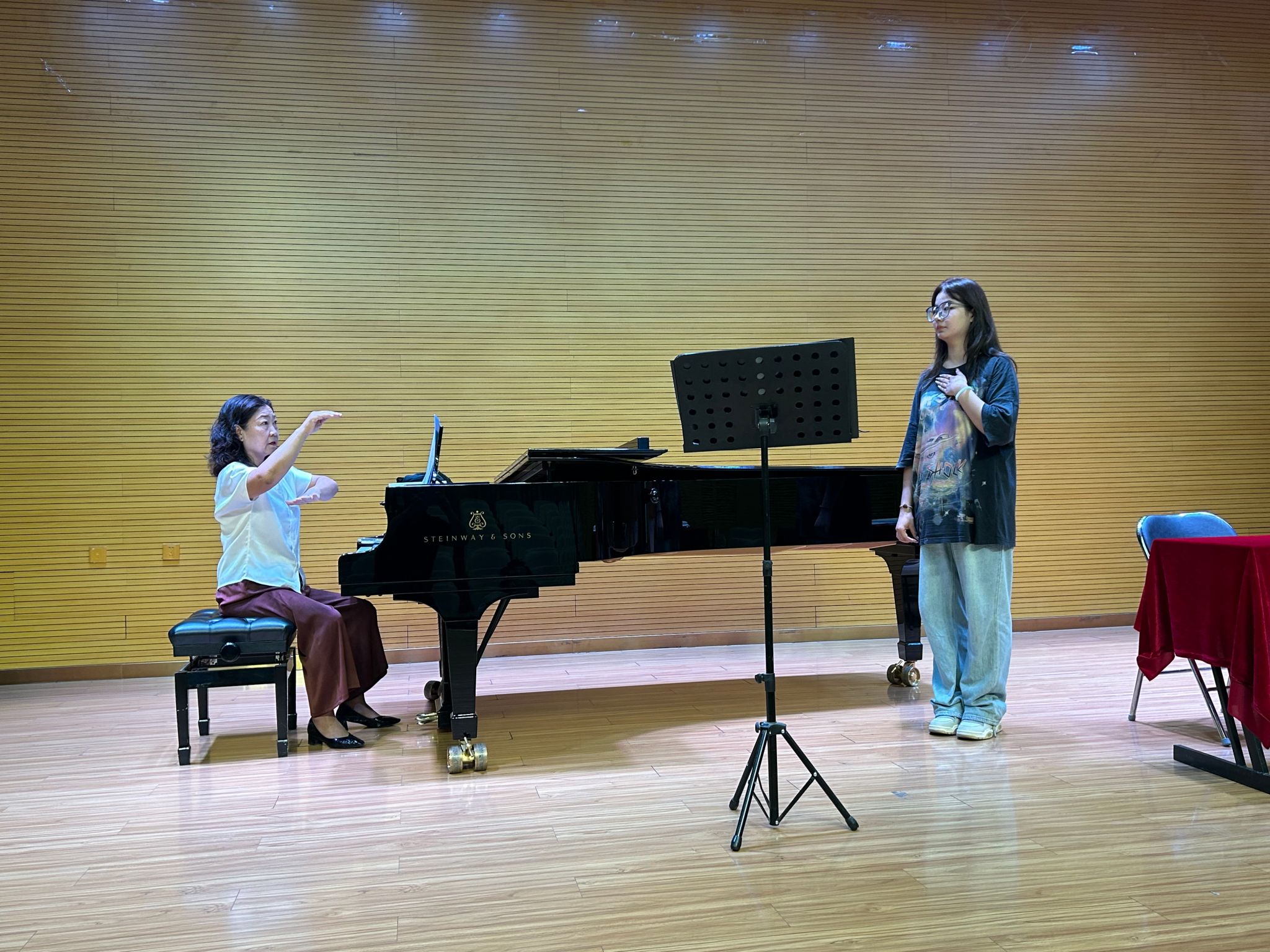 圖為吳靈萍老師進(jìn)行中國(guó)藝術(shù)歌曲《虞美人·聽(tīng)雨》演唱技巧與情感表達(dá)的講解授課